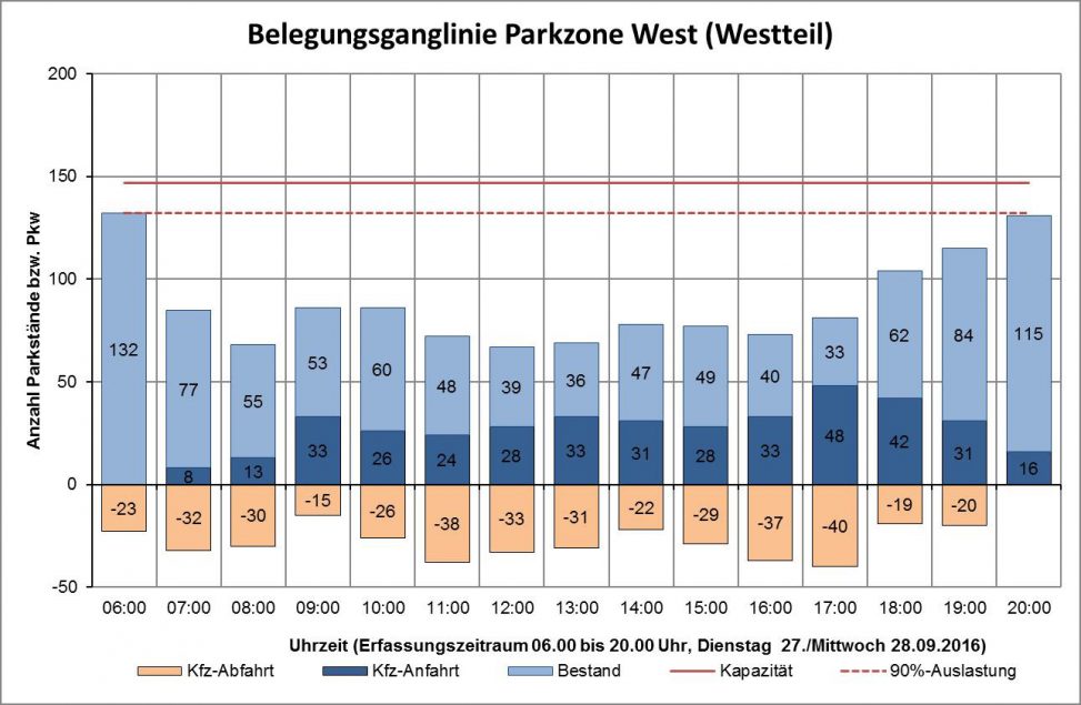 - detaillierte Erhebungen zur Parkraumnachfrage und Auslastung der vorhandenen Kapazitäten (Belegungsganglinien, Parkdauerverteilung), Rückschlüsse auf die verschiedenen Nutzergruppen (Bewohner, Berufstätige, Kunden, Besucher)