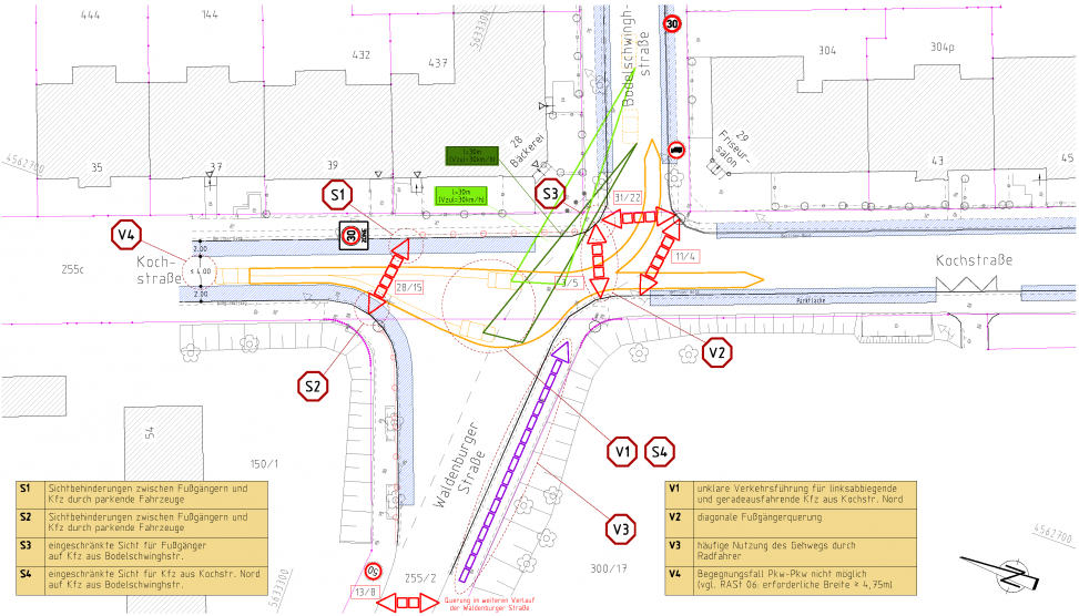 - Erarbeitung von Vorschlägen zur Verkehrsführung im Planungsgebiet und zum Umbau von zwei Knoten-punkten mit Prüfung der Sichtweiten und der geometrischen Befahrbarkeit für alle relevanten Begegnungsfälle