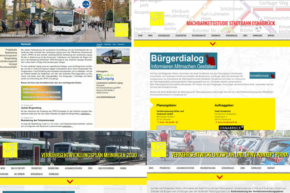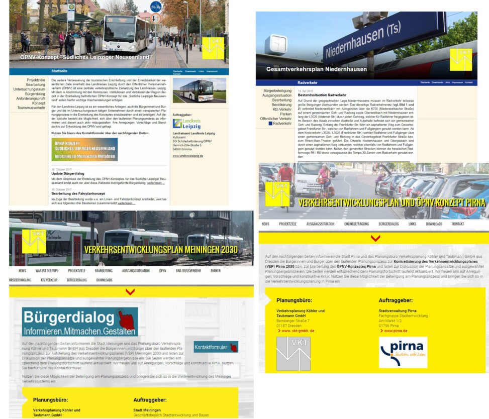 - Erstellung, Administration und inhaltlich fachliche Betreuung von webbasierten Projektinformationen im Rahmen der Öffentlichkeitsarbeit und Beteiligung unter eigener projektspezifischer Domain, welche mit dem jeweiligen Internetauftritt des Auftraggebers verlinkt werden können