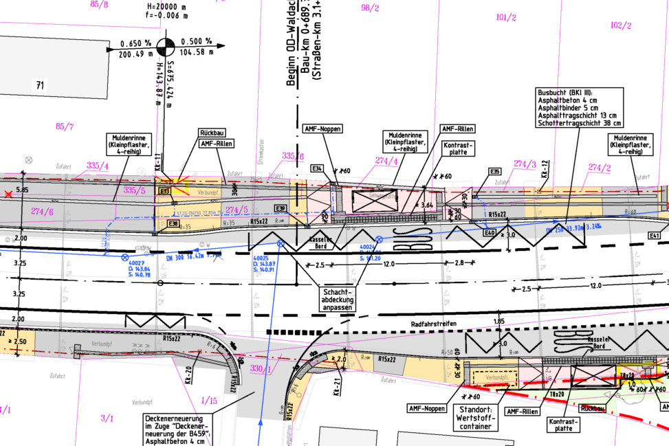 Planung der Umgestaltung einer Ortsdurchfahrt mit einer Länge von 1.600 m – Planung des barrierefreien Umbaus von 4 Bushaltestellen –…